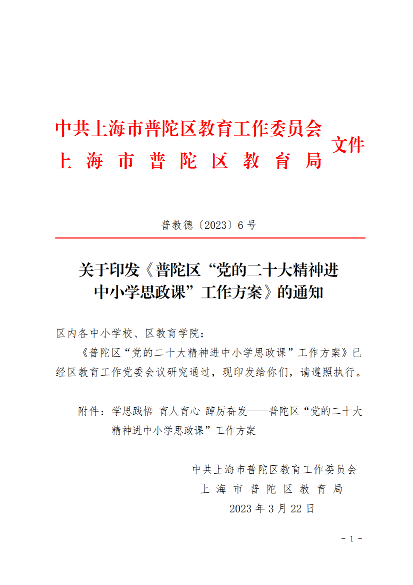 附件:学思践悟 育人育心 踔厉奋发——普陀区“党的二十大精神进中小学思政课”工作方案