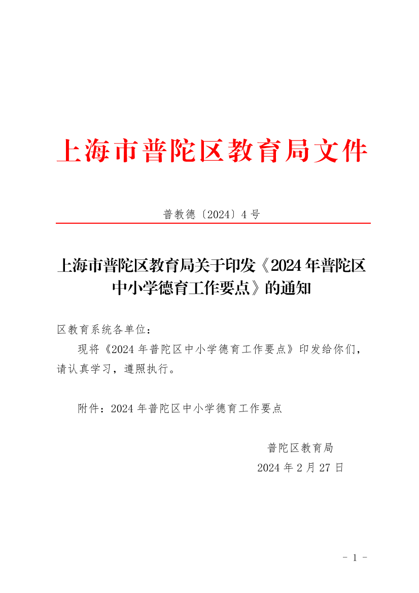 关于印发《2024年普陀区中小学德育工作要点》的通知