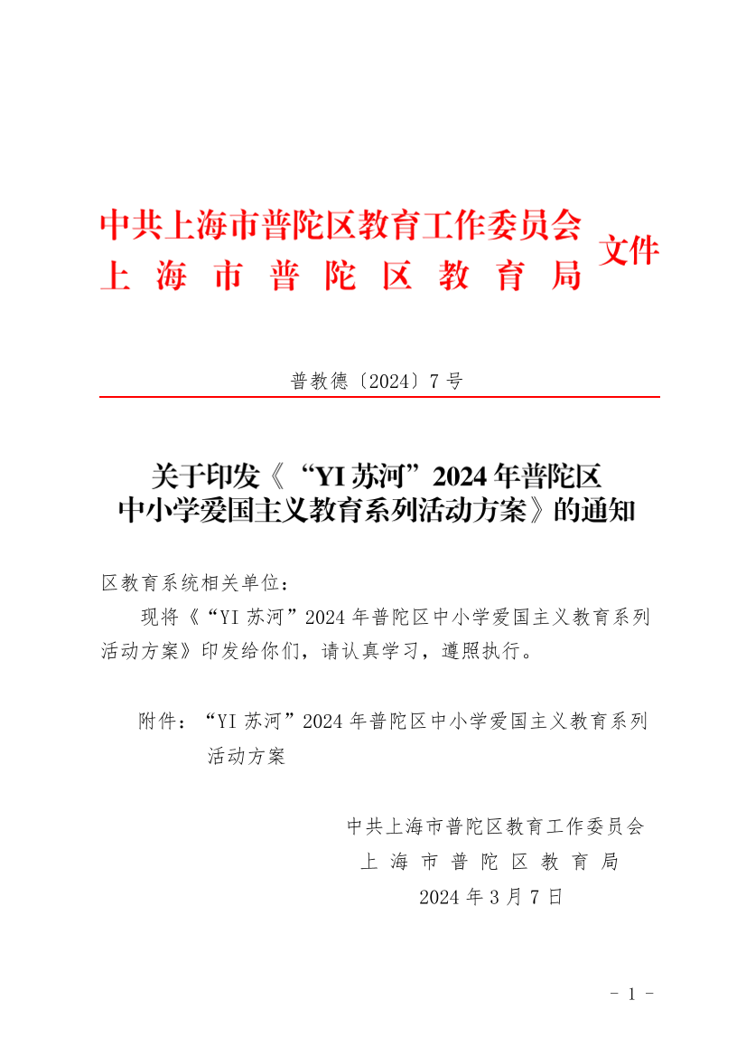 关于印发《“YI苏河”2024年普陀区中小学爱国主义教育系列活动方案》的通知