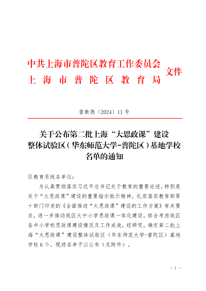 为认真贯彻落实习近平总书记关于教育的重要论述,特别是关于“大思政课”建设的重要指示批示精神,扎实落实教育部等十部门印发的《全面推进“大思政课”建设的工作方案》有关要求,进一步推动我区大中小学思政课一体化建设,综合考虑我区各中小学校思政课建设情况及工作成效,经研究,确定第二批上海“大思政课”建设整体试验区(华东师范大学-普陀区)基地学校6个。现将名单予以公布(见附件)。
