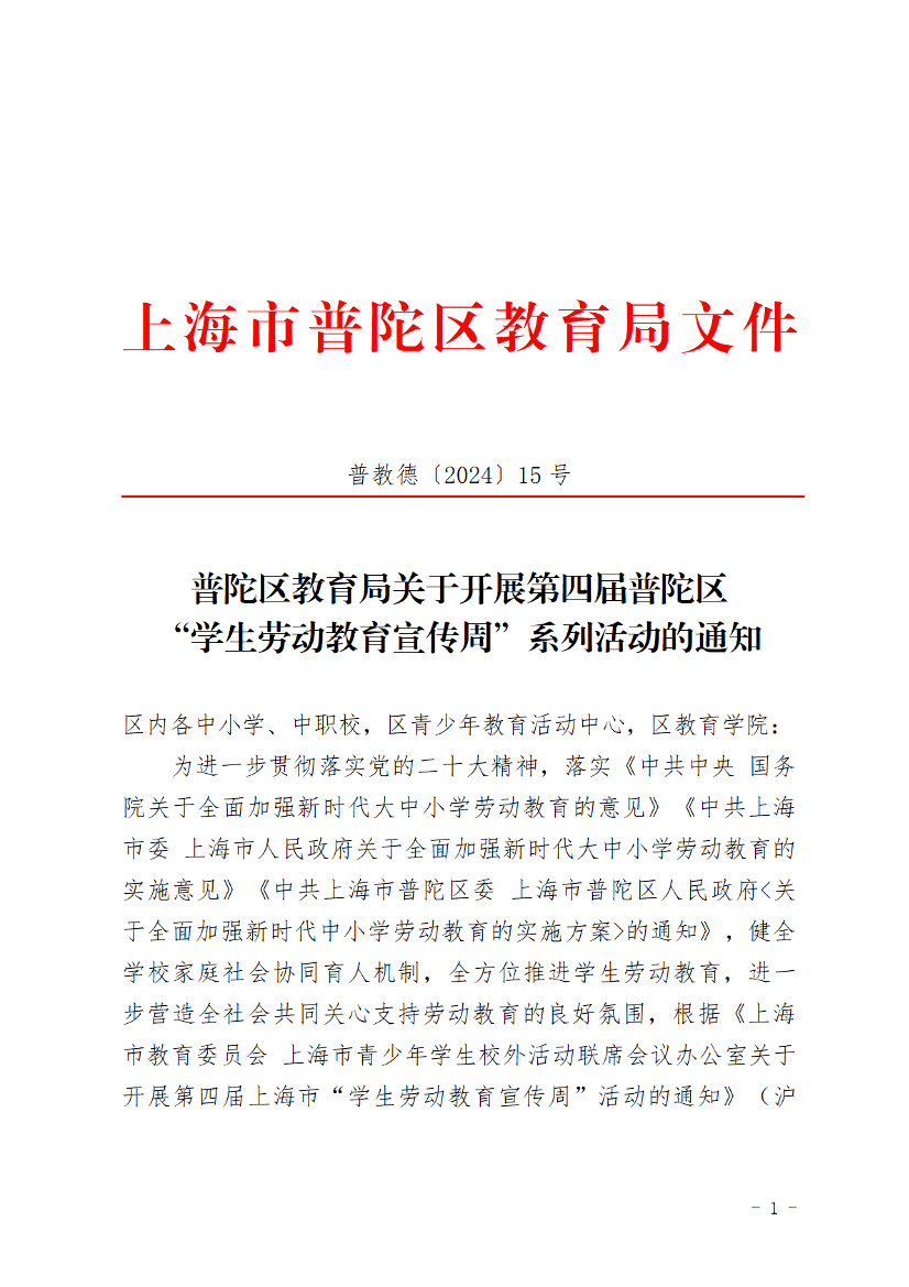 为进一步贯彻落实党的二十大精神,落实《中共中央 国务院关于全面加强新时代大中小学劳动教育的意见》《中共上海市委 上海市人民政府关于全面加强新时代大中小学劳动教育的实施意见》《中共上海市普陀区委 上海市普陀区人民政府<关于全面加强新时代中小学劳动教育的实施方案>的通知》,健全学校家庭社会协同育人机制,全方位推进学生劳动教育,进一步营造全社会共同关心支持劳动教育的良好氛围,根据《上海市教育委员会 上海市青少年学生校外活动联席会议办公室关于开展第四届上海市“学生劳动教育宣传周”活动的通知》(沪教委德〔2024〕12号),现就做好第四届本区“学生劳动教育宣传周”系列活动(以下简称“宣传周”)有关事项通知如下: