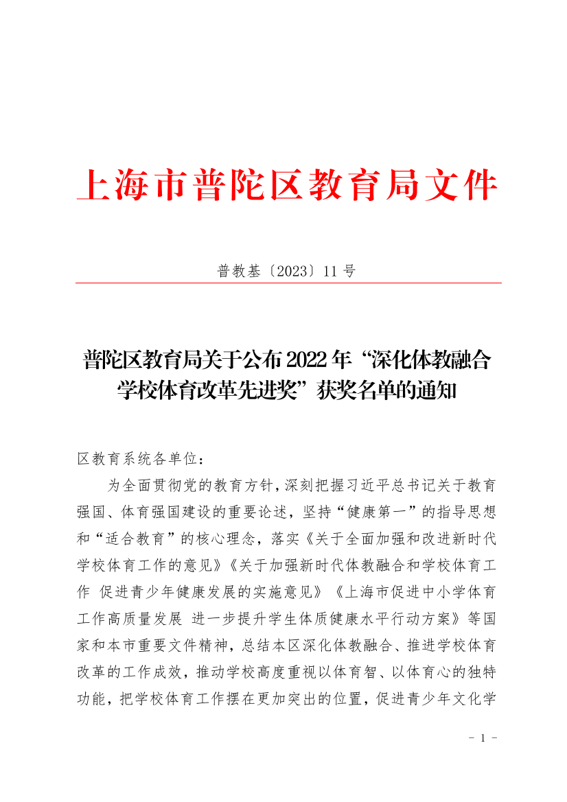 为全面贯彻党的教育方针,深刻把握习近平总书记关于教育强国、体育强国建设的重要论述,坚持“健康第一”的指导思想和“适合教育”的核心理念,落实《关于全面加强和改进新时代学校体育工作的意见》《关于加强新时代体教融合和学校体育工作 促进青少年健康发展的实施意见》《上海市促进中小学体育工作高质量发展 进一步提升学生体质健康水平行动方案》等国家和本市重要文件精神,总结本区深化体教融合、推进学校体育改革的工作成效,推动学校高度重视以体育智、以体育心的独特功能,把学校体育工作摆在更加突出的位置,促进青少年文化学习和体育锻炼协调发展,培养德智体美劳全面发展的社会主义建设者和接班人,营造全社会共同促进学校体育发展的良好社会氛围,区教育局会同区体育局、区教育奖励基金会开展了“2022年度普陀区深化体教融合学校体育改革先进奖”评选。经研究决定,曹杨第二中学等12个单位为“2022年度普陀区学校体育改革先进奖(集体奖)优秀奖”,华东师范大学附属小学等12个单位为“2022年度普陀区学校体育改革先进奖(集体奖)优胜奖”,华东师范大学第四附属中学等12个单位为“2022年度普陀区学校体育改革先进奖(集体奖)提名奖”;曹杨第二中学的街舞社团等10个社团为“2022年度普陀区学校最佳体育社团奖”;上海金洲小学潘阿芳等2人为“2022年度普陀区学校最佳体育贡献校长奖”;上海市文达学校黄晓峰等2人为“2022年度普陀区学校体育改革先进奖(个人)体育成就奖”,上海市文达学校缪向群等5人为“2022年度普陀区学校体育管理创新奖”,曹杨第二中学方超杰等5人为“2022年度普陀区学校体育教科研创新奖”,曹杨第二中学顾小兴等7人为“2022年度普陀区学校最佳活力园丁奖”,新普陀小学魏菩黎等11人为“2022年度普陀区学校最佳阳光体育达人奖”。