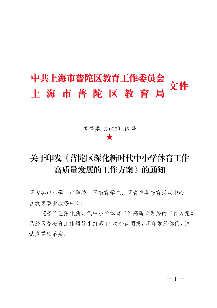 关于印发《普陀区深化新时代中小学体育工作高质量发展的工作方案》的通知
