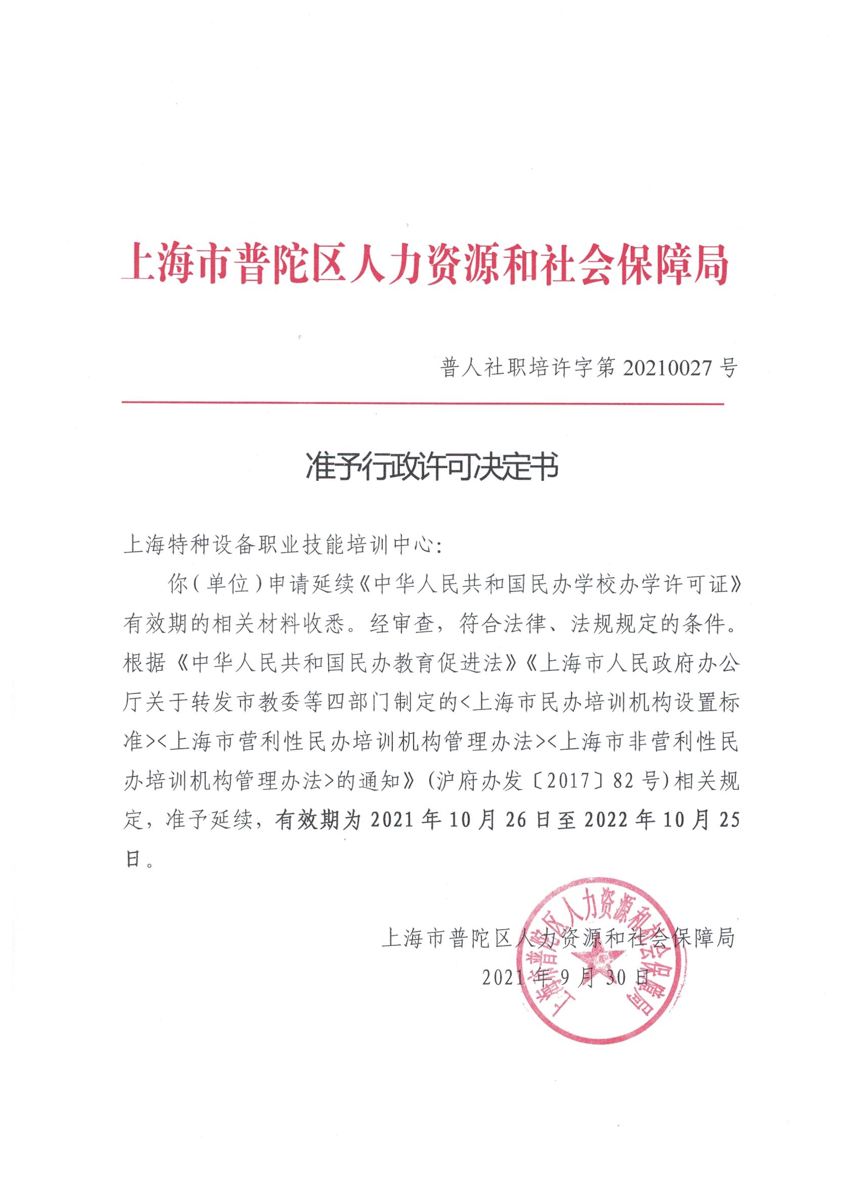你(单位)申请延续《中华人民共和国民办学校办学许可证》有效期的相关材料收悉。经审查,符合法律、法规规定的条件。根据《中华人民共和国民办教育促进法》《上海市人民政府办公厅关于转发市教委等四部门制定的<上海市民办培训机构设置标准><上海市营利性民办培训机构管理办法><上海市非营利性民办培训机构管理办法>的通知》(沪府办发〔2017〕82号)相关规定,准予延续,有效期为2021年10月26日至2022年10月25日。