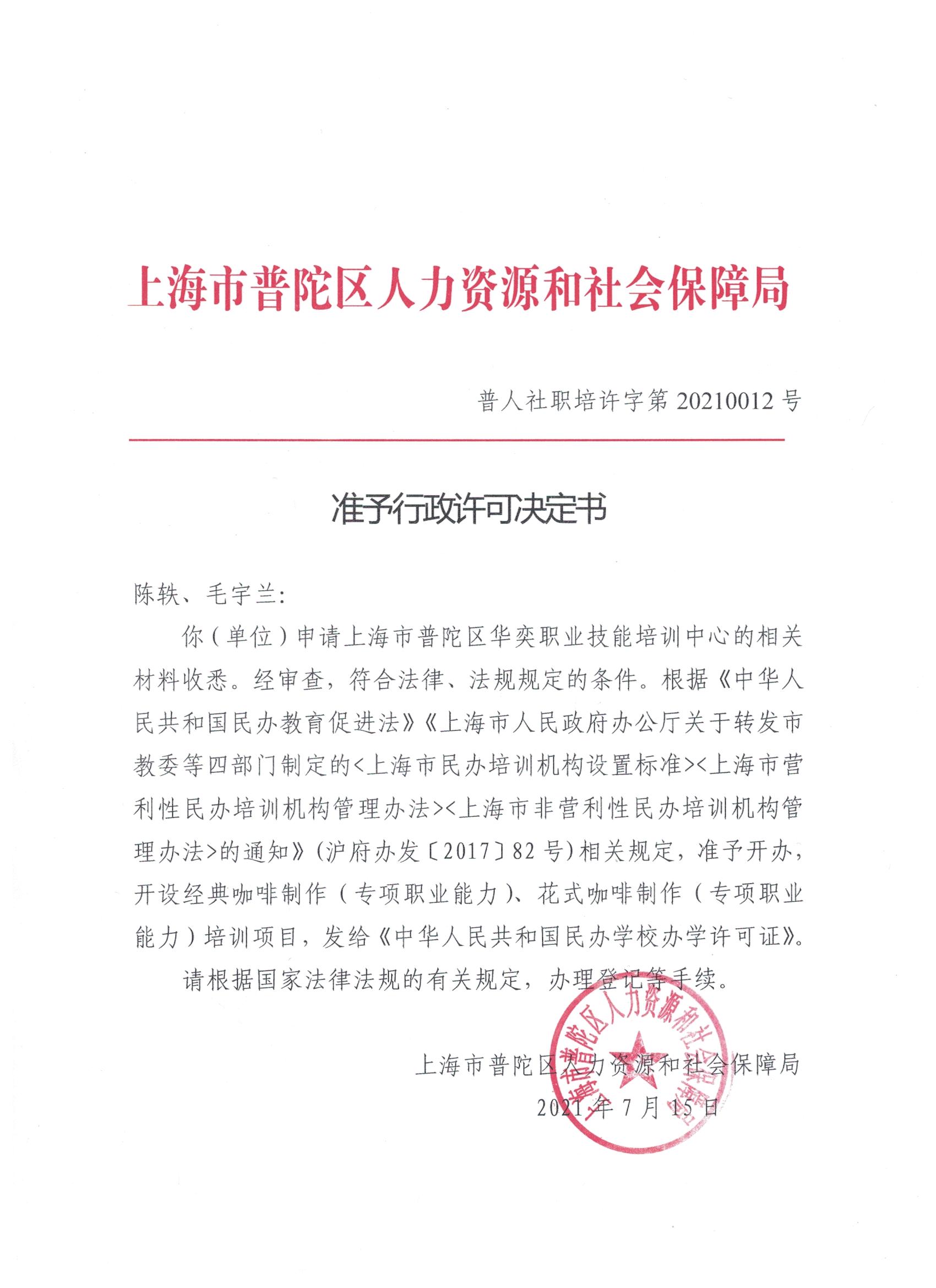 你(单位)申请上海市普陀区华奕职业技能培训中心的相关材料收悉。经审查,符合法律、法规规定的条件。根据《中华人民共和国民办教育促进法》《上海市人民政府办公厅关于转发市教委等四部门制定的<上海市民办培训机构设置标准><上海市营利性民办培训机构管理办法><上海市非营利性民办培训机构管理办法>的通知》(沪府办发〔2017〕82号)相关规定,准予开办,开设经典咖啡制作(专项职业能力)、花式咖啡制作(专项职业能力)培训项目,发给《中华人民共和国民办学校办学许可证》。