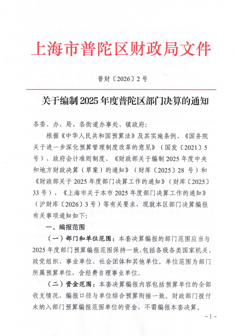 根据《中华人民共和国预算法》及其实施条例、《国务院关于进一步深化预算管理制度改革的意见》(国发〔2021〕5号)、政府会计准则制度、《财政部关于编制2025年度中央和地方财政决算(草案)的通知》(财库〔2025〕28 号)和《财政部关于2025年度部门决算工作的通知》(财库〔2025〕33号)、《上海市关于本市2025年度部门决算工作的通知》(沪财库〔2026〕3号)等有关要求,现就本区部门决算编报有关事项通知如下: