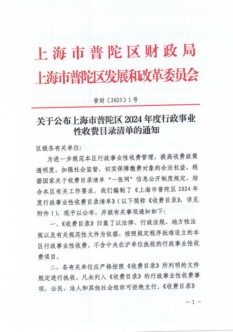 关于公布上海市普陀区2024年度行政事业性收费目录清单的通知