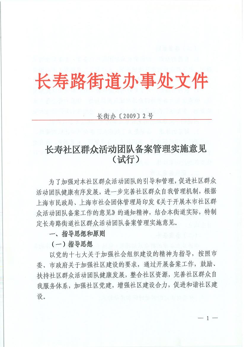 为了加强对本社区群众活动团队的引导和管理,促进社区群众活动团队健康有序发展,进一步完善社区群众自我管理机制,根据上海市民政局、上海市社会团体管理局印发《关于开展本市社区群众活动团队备案工作的意见》的通知精神,结合本街道实际,特制定长寿路街道社区群众活动团队备案管理实施意见。