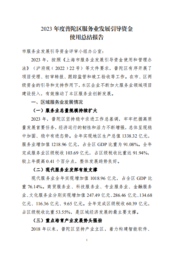 2023年,通过市、区两级引导资金的投入,带动了一批服务业新兴领域项目实施,促进了各类市场主体创新发展、服务业平台建设提升,为区域产业转型升级提供了坚实的支撑。