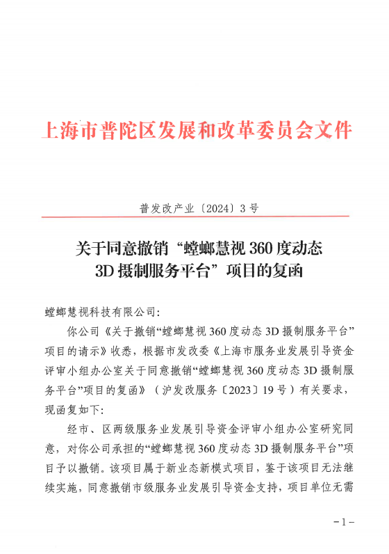 你公司《关于撤销“螳螂慧视360度动态3D摄制服务平台”项目的请示》收悉,根据市发改委《上海市服务业发展引导资金评审小组办公室关于同意撤销“螳螂慧视360度动态3D摄制服务平台”项目的复函》(沪发改服务〔2023〕19号)有关要求,现函复如下: