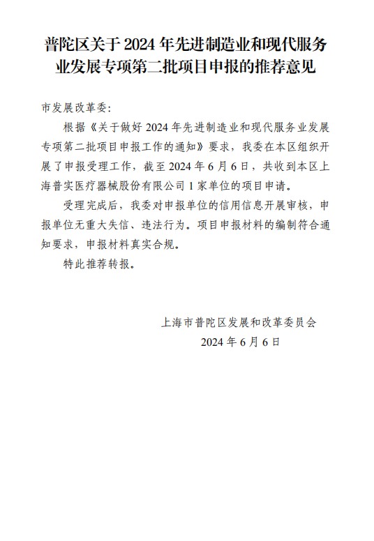 根据《关于做好2024年先进制造业和现代服务业发展专项第二批项目申报工作的通知》要求,我委在本区组织开展了申报受理工作,截至2024年6月6日,共收到本区上海普实医疗器械股份有限公司1家单位的项目申请。