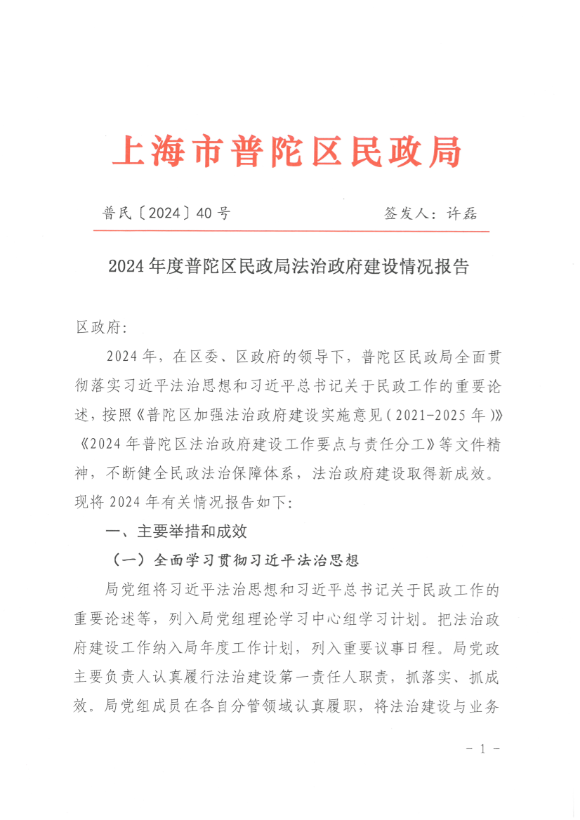 2024年,在区委、区政府的领导下,普陀区民政局全面贯彻落实习近平法治思想和习近平总书记关于民政工作的重要论述,按照《普陀区加强法治政府建设实施意见(2021-2025年)》《2024年普陀区法治政府建设工作要点与责任分工》等文件精神,不断健全民政法治保障体系,法治政府建设取得新成效。现将2024年有关情况报告如下: