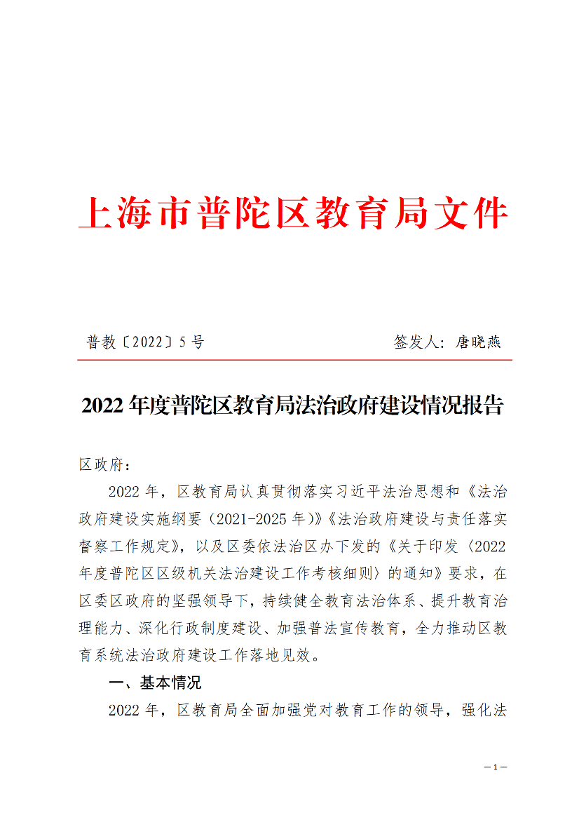 2022年,区教育局认真贯彻落实习近平法治思想和《法治政府建设实施纲要(2021-2025年)》《法治政府建设与责任落实督察工作规定》,以及区委依法治区办下发的《关于印发〈2022年度普陀区区级机关法治建设工作考核细则〉的通知》要求,在区委区政府的坚强领导下,持续健全教育法治体系、提升教育治理能力、深化行政制度建设、加强普法宣传教育,全力推动区教育系统法治政府建设工作落地见效。