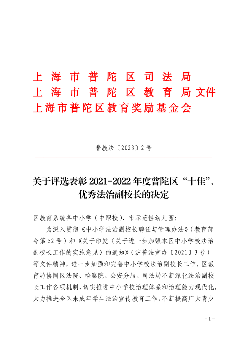关于评选表彰2021-2022年度普陀区“十佳”、优秀法治副校长的决定