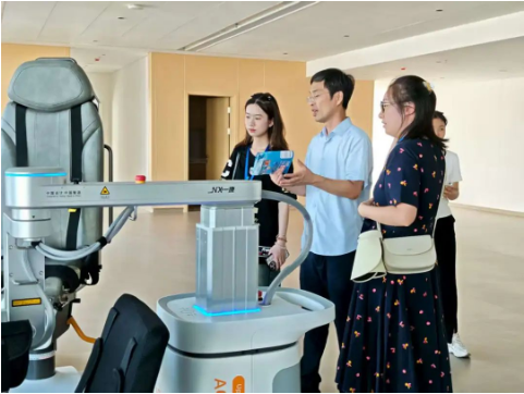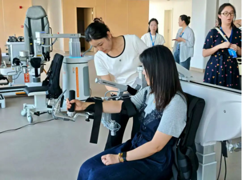 现场观摩中,普陀区康复医院工作人员带领企业及群众代表参观新竣工验收的康复大楼,介绍各项康复器械的用途。