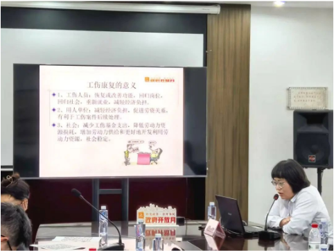 座谈会上,普陀区康复医院向受邀代表介绍未来普陀区康复医院科室设置、医疗人员配备规划及特色技术。同时,从医学专业角度向受邀代表介绍工伤康复的重要性和必要性。区人社局向受邀代表介绍业务办理依据、申请条件、申请流程等劳动能力鉴定及住院工伤康复相关政策内容,认真听取受邀代表提出的问题及意见建议,并一一作出回应,获得受邀代表的一致好评。