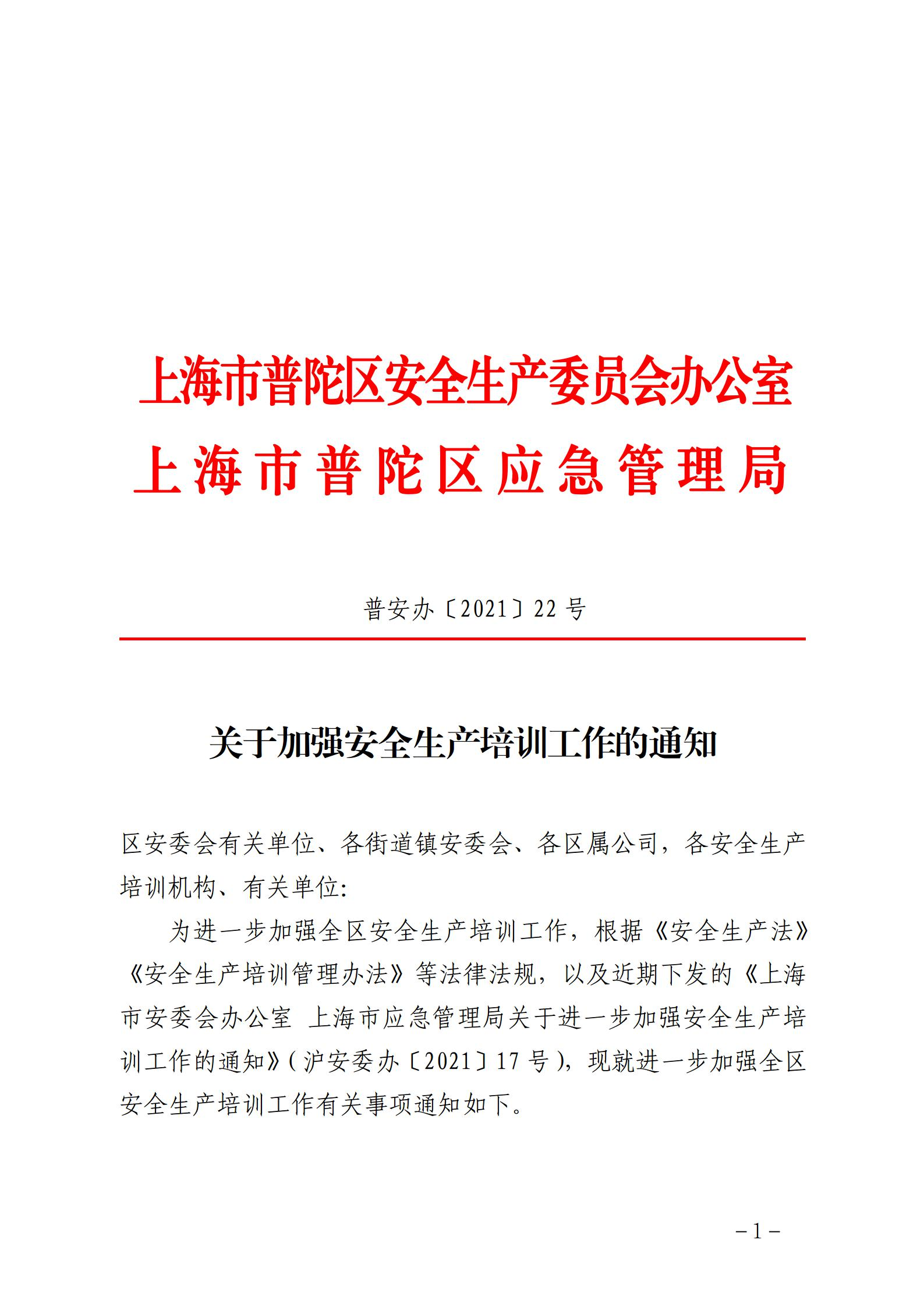 为进一步加强全区安全生产培训工作,根据《安全生产法》《安全生产培训管理办法》等法律法规,以及近期下发的《上海市安委会办公室 上海市应急管理局关于进一步加强安全生产培训工作的通知》(沪安委办〔2021〕17号),现就进一步加强全区安全生产培训工作有关事项通知如下。