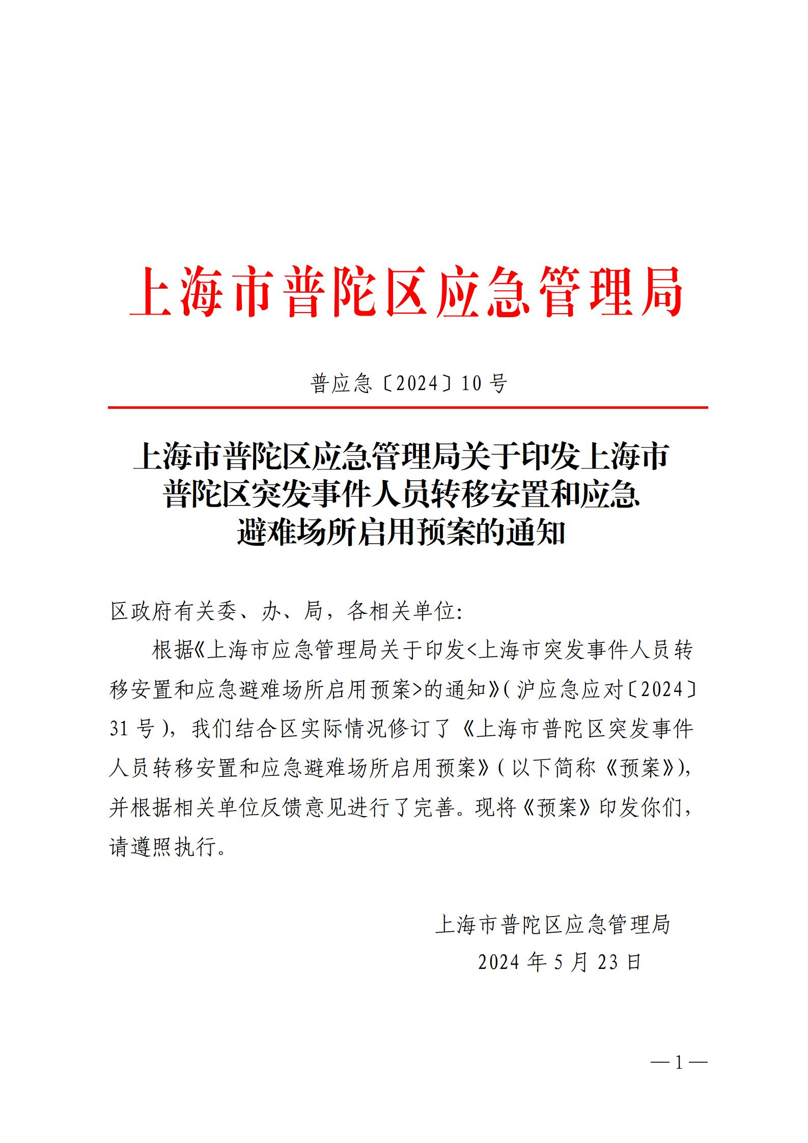 上海市普陀区应急管理局关于印发上海市普陀区突发事件人员转移安置和应急避难场所启用预案的通知