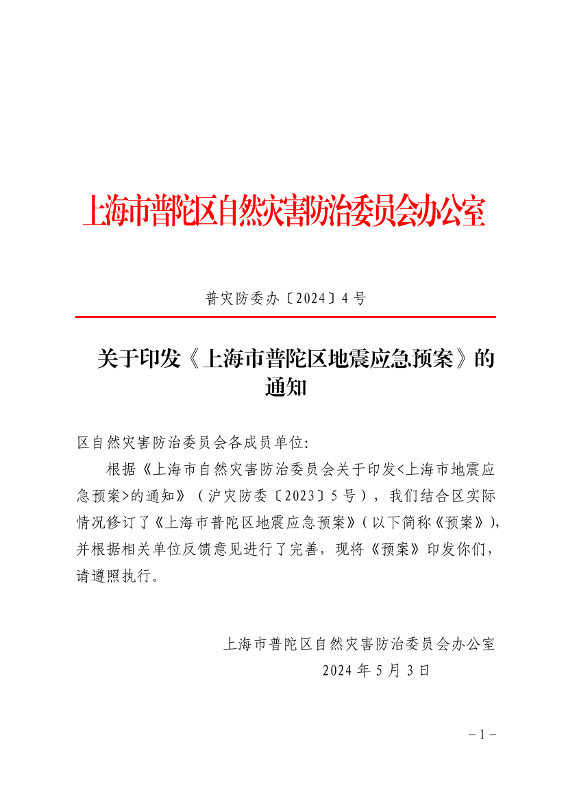 根据《上海市自然灾害防治委员会关于印发<上海市地震应急预案>的通知》(沪灾防委〔2023〕5号),我们结合区实际情况修订了《上海市普陀区地震应急预案》(以下简称《预案》),并根据相关单位反馈意见进行了完善,现将《预案》印发你们,请遵照执行。