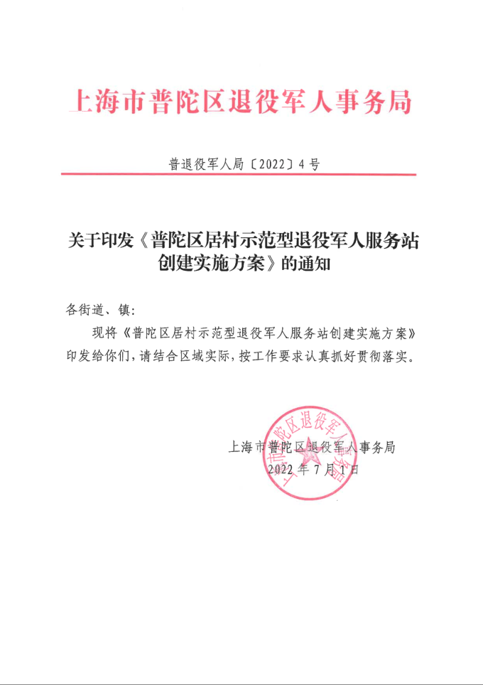 现将《普陀区居村示范型退役军人服务站创建实施方案》印发给你们,请结合区域实际,按工作要求认真抓好贯彻落实。