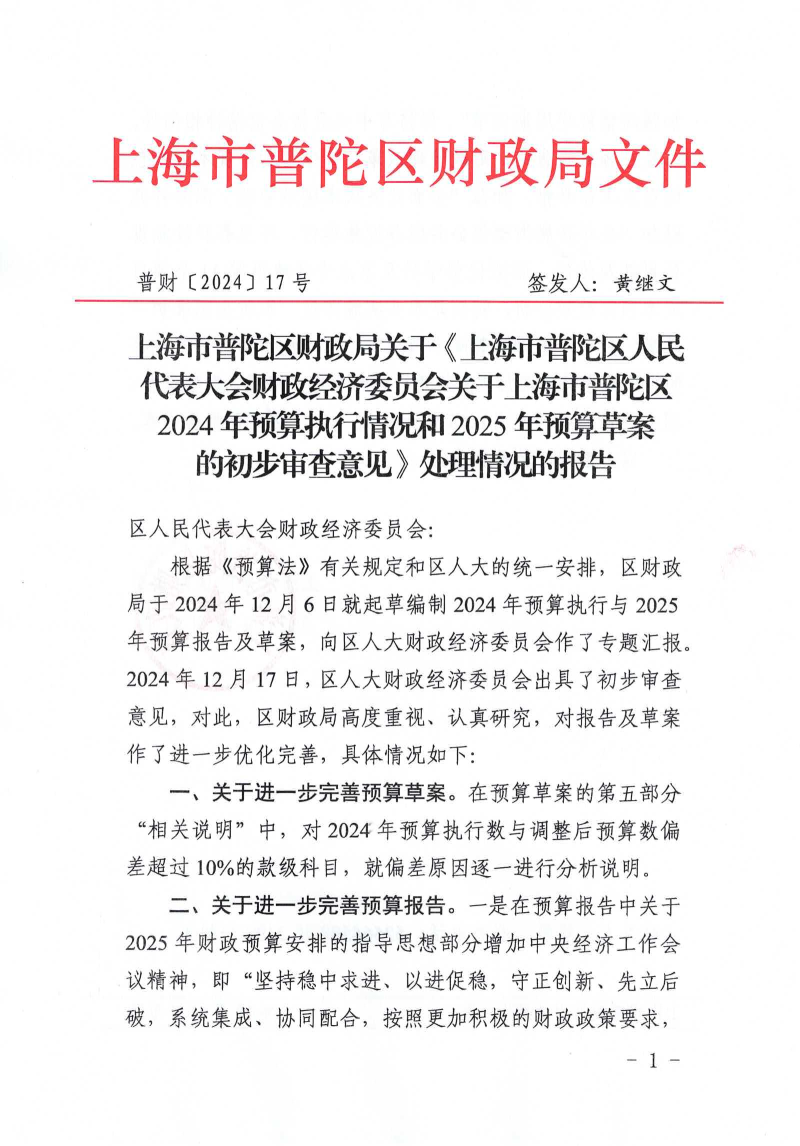 上海市普陀区财政局关于《上海市普陀区人民代表大会财政经济委员会关于上海市普陀区2024年预算执行情况和2025年预算草案的初步审查意见》处理情况的报告