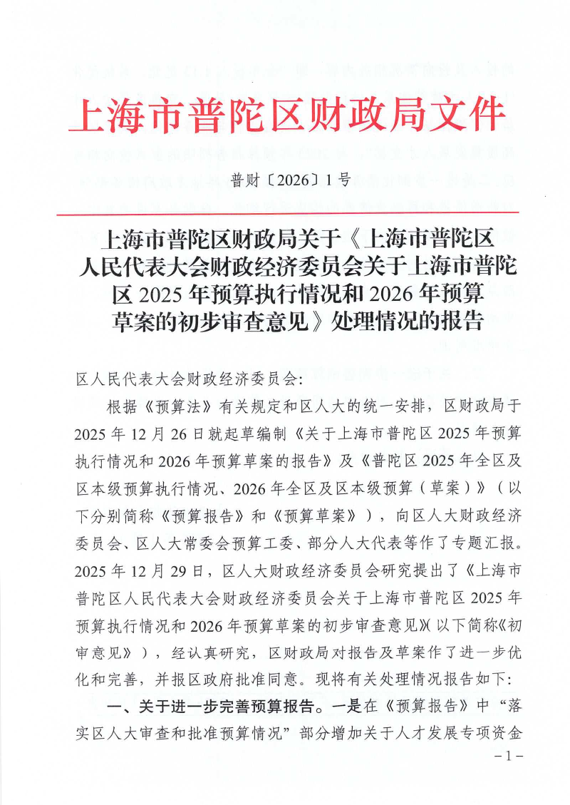 根据《预算法》有关规定和区人大的统一安排,区财政局于2025年12月26日就起草编制《关于上海市普陀区2025年预算执行情况和2026年预算草案的报告》及《普陀区2025年全区及区本级预算执行情况、2026年全区及区本级预算(草案)》(以下分别简称《预算报告》和《预算草案》),向区人大财政经济委员会、区人大常委会预算工委、部分人大代表等作了专题汇报。2025年12月29日,区人大财政经济委员会研究提出了《上海市普陀区人民代表大会财政经济委员会关于上海市普陀区2025年预算执行情况和2026年预算草案的初步审查意见》(以下简称《初审意见》),经认真研究,区财政局对报告及草案作了进一步优化和完善,并报区政府批准同意。现将有关处理情况报告如下: