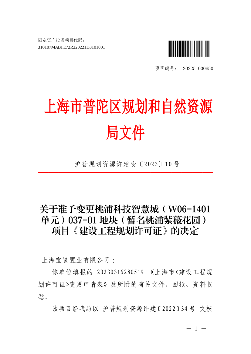关于准予变更桃浦科技智慧城(W06-1401单元)037-01地块(暂名桃浦紫薇花园)项目《建设工程规划许可证》的决定