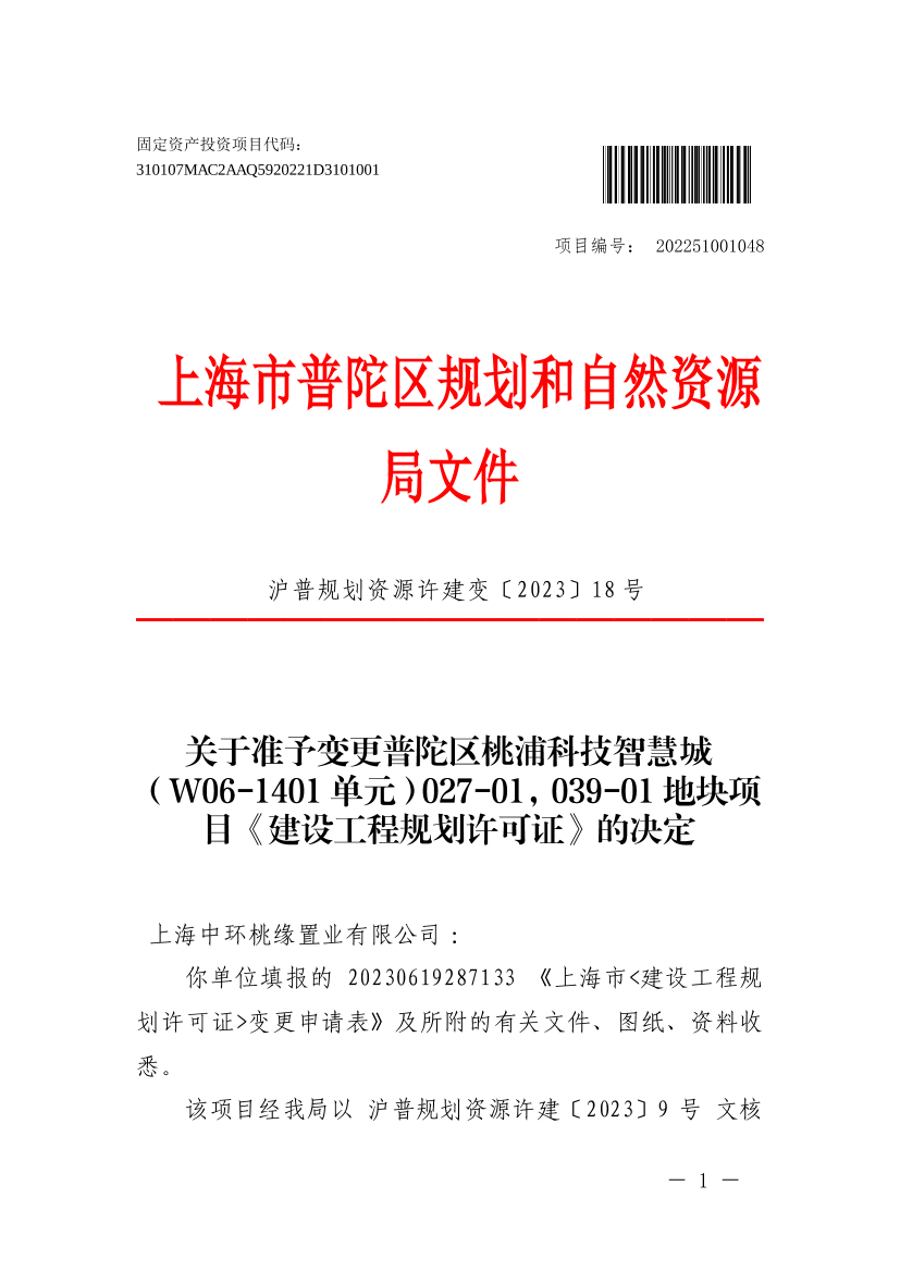 关于准予变更普陀区桃浦科技智慧城(W06-1401单元)027-01,039-01地块项目《建设工程规划许可证》的决定