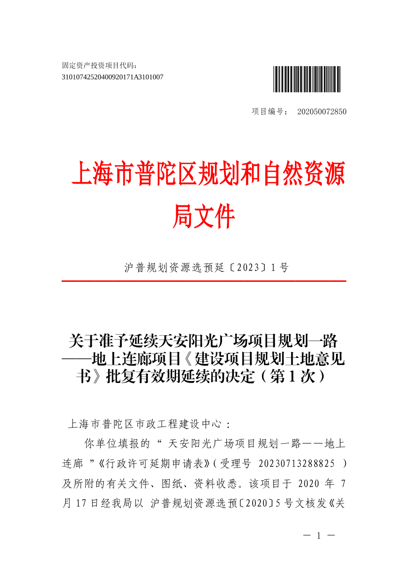 你单位填报的“天安阳光广场项目规划一路——地上连廊”《行政许可延期申请表》(受理号20230713288825)及所附的有关文件、图纸、资料收悉。该项目于2020年7月17日经我局以沪普规划资源选预〔2020〕5号文核发《关于审定天安阳光广场项目规划一路——地上连廊建设项目规划土地意见书的决定》(证号沪普书(2020)BA310107202000655,以下简称《决定》)。现你(单位)向我局提出延续《决定》有效期的申请。