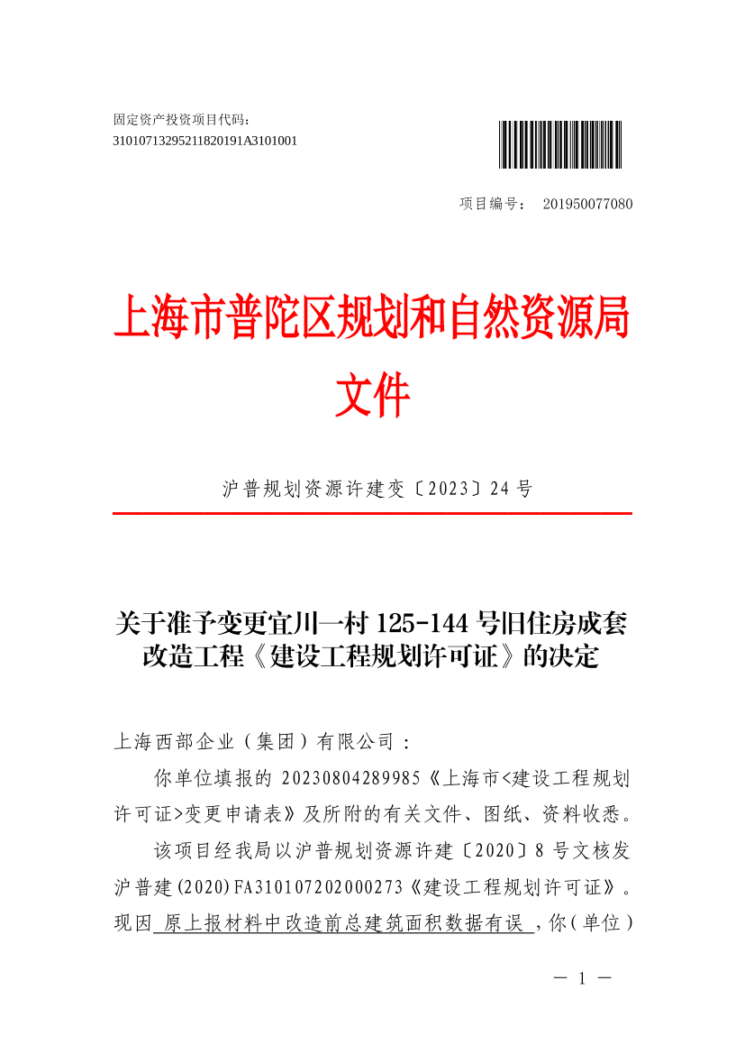 关于准予变更宜川一村125-144号旧住房成套改造工程《建设工程规划许可证》的决定