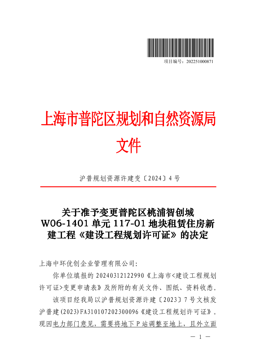 关于准予变更普陀区桃浦智创城W06-1401单元117-01地块租赁住房新建工程《建设工程规划许可证》的决定