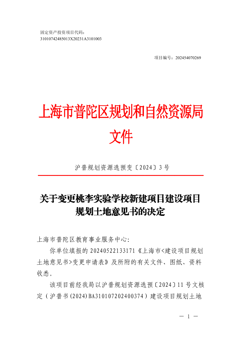 经审核,根据《中华人民共和国行政许可法》、《中华人民共和国城乡规划法》、《上海市城乡规划条例》和本市城乡规划、土地、建设管理等有关规定,我局准予变更项目名称:由“中以创新园九年一贯制学校新建项目”变更为“桃李实验学校新建项目”,其他未予变更事项仍按照沪普规划资源选预〔2024〕11号文执行。