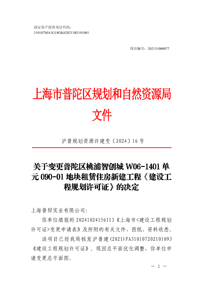 关于变更普陀区桃浦智创城W06-1401单元090-01地块租赁住房新建工程《建设工程规划许可证》的决定
