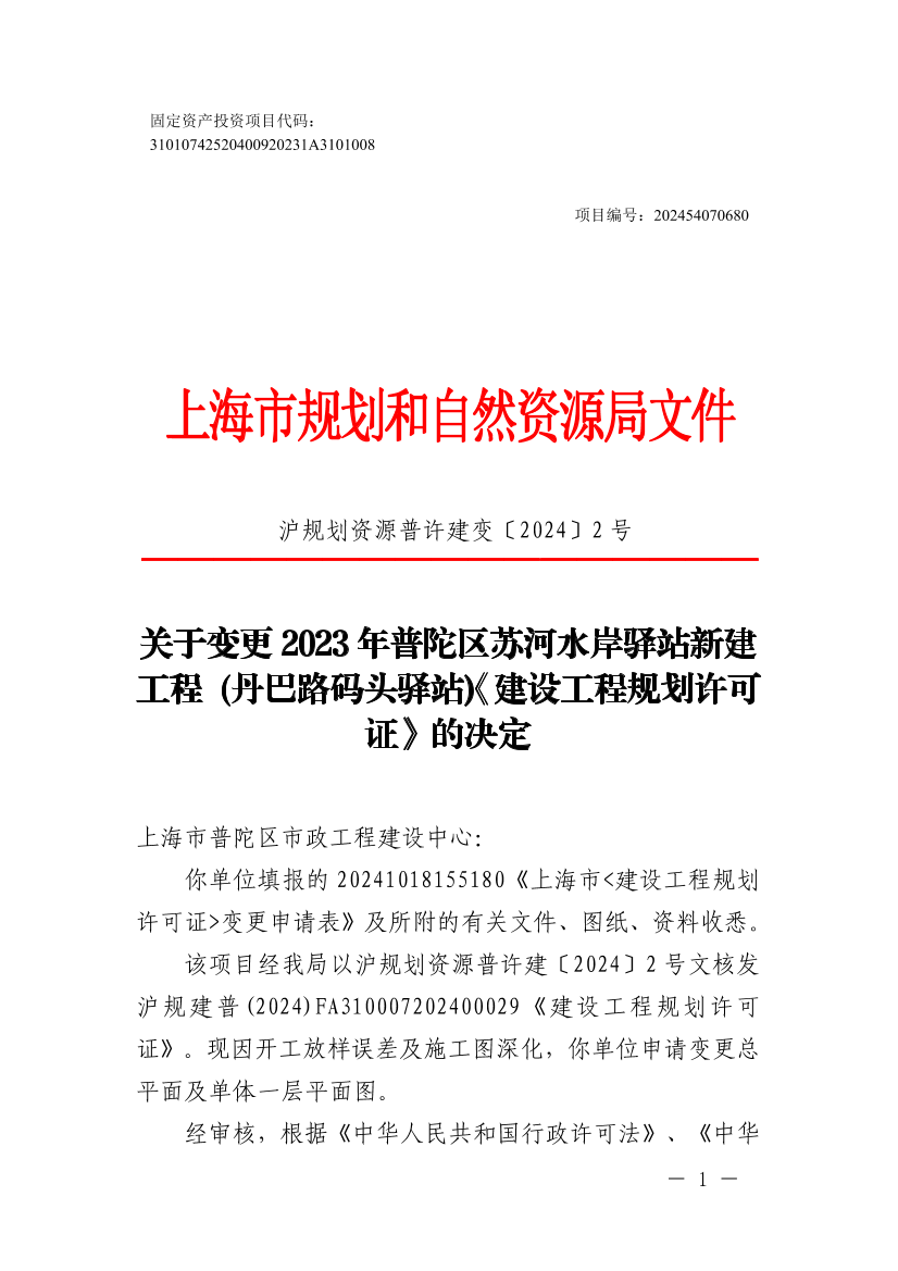该项目经我局以沪规划资源普许建〔2024〕2号文核发沪规建普(2024)FA310007202400029《建设工程规划许可证》。现因开工放样误差及施工图深化,你单位申请变更总平面及单体一层平面图。