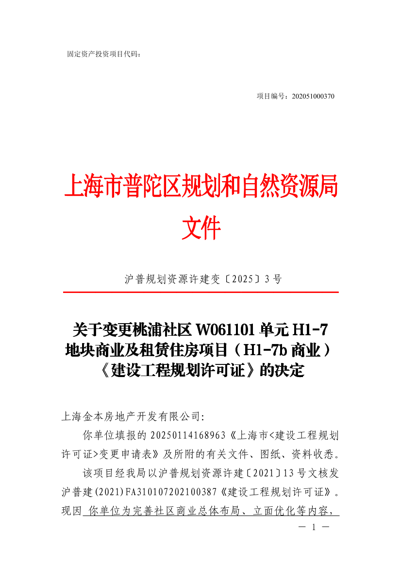 关于变更桃浦社区W061101单元H1-7地块商业及租赁住房项目(H1-7b商业)《建设工程规划许可证》的决定
