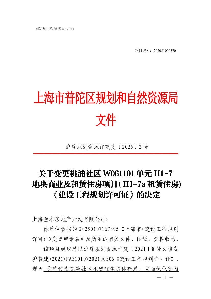 关于变更桃浦社区W061101单元H1-7地块商业及租赁住房项目(H1-7a租赁住房)《建设工程规划许可证》的决定