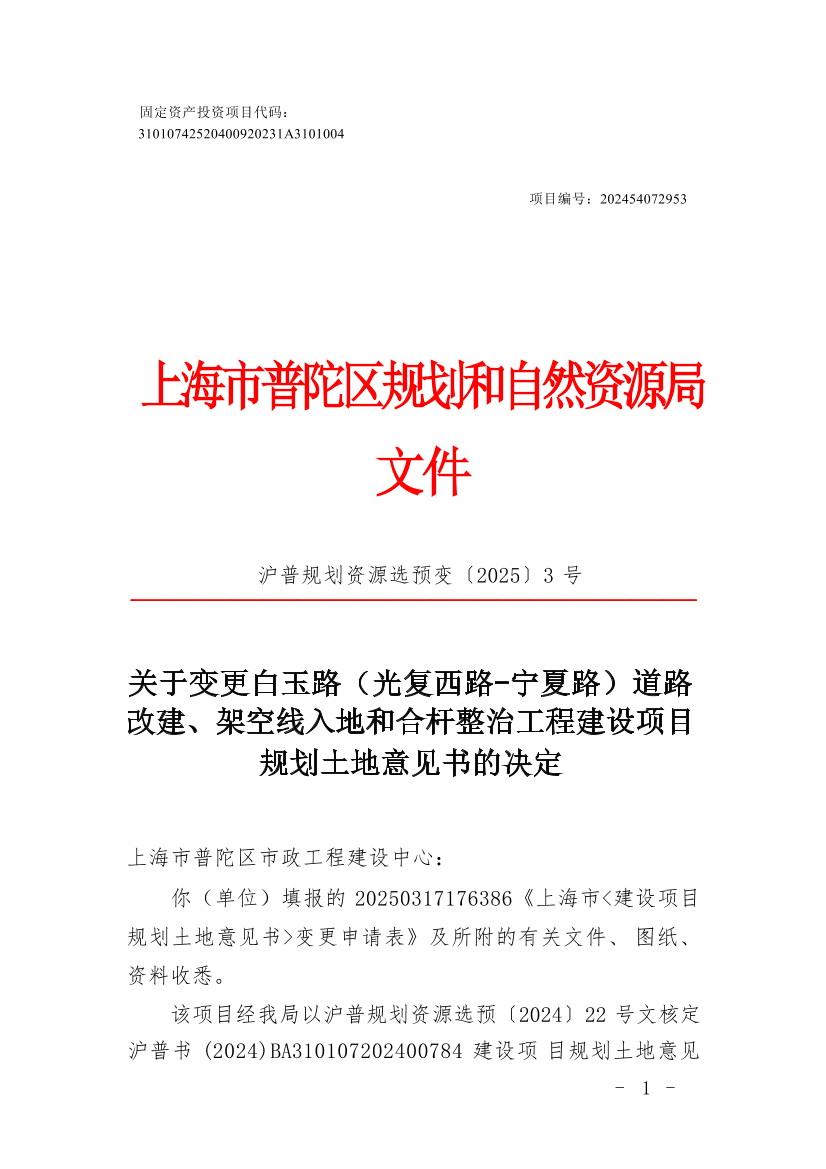 关于变更白玉路(光复西路-宁夏路)道路改建、架空线入地和合杆整治工程建设项目规划土地意见书的决定