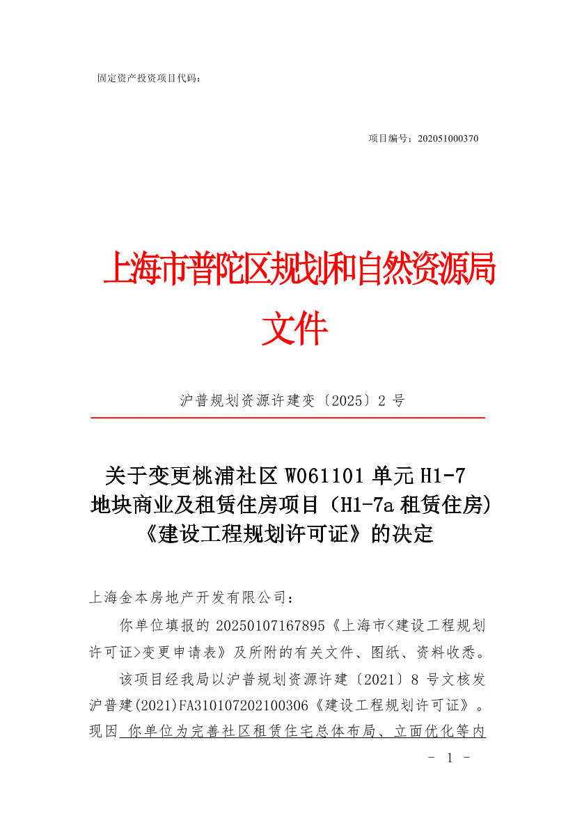 关于变更桃浦社区W061101单元H1-7地块商业及租赁住房项目(H1-7a租赁住房)《建设工程规划许可证》的决定