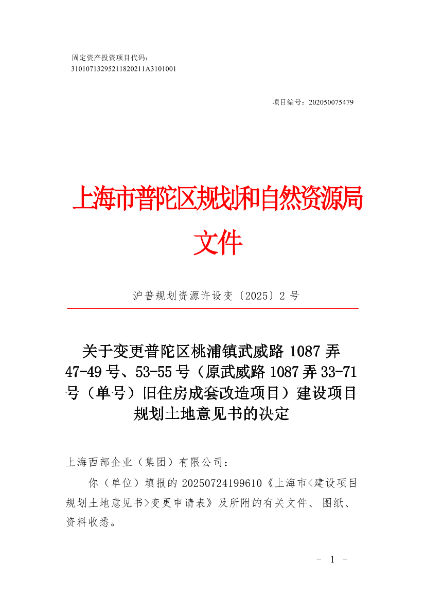 关于变更普陀区桃浦镇武威路1087弄47-49号、53-55号(原武威路1087弄33-71号(单号)旧住房成套改造项目)建设项目规划土地意见书的决定