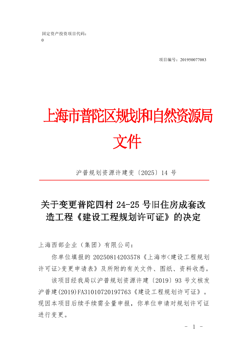 该项目经我局以沪普规划资源许建〔2019〕93号文核发沪普建(2019)FA31010720197763《建设工程规划许可证》。现因本项目后续手续需全量申报,你单位申请对规划许可证进行变更。