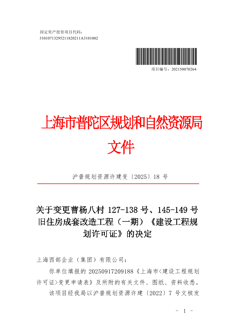 关于变更曹杨八村127-138号、145-149号旧住房成套改造工程(一期)《建设工程规划许可证》的决定