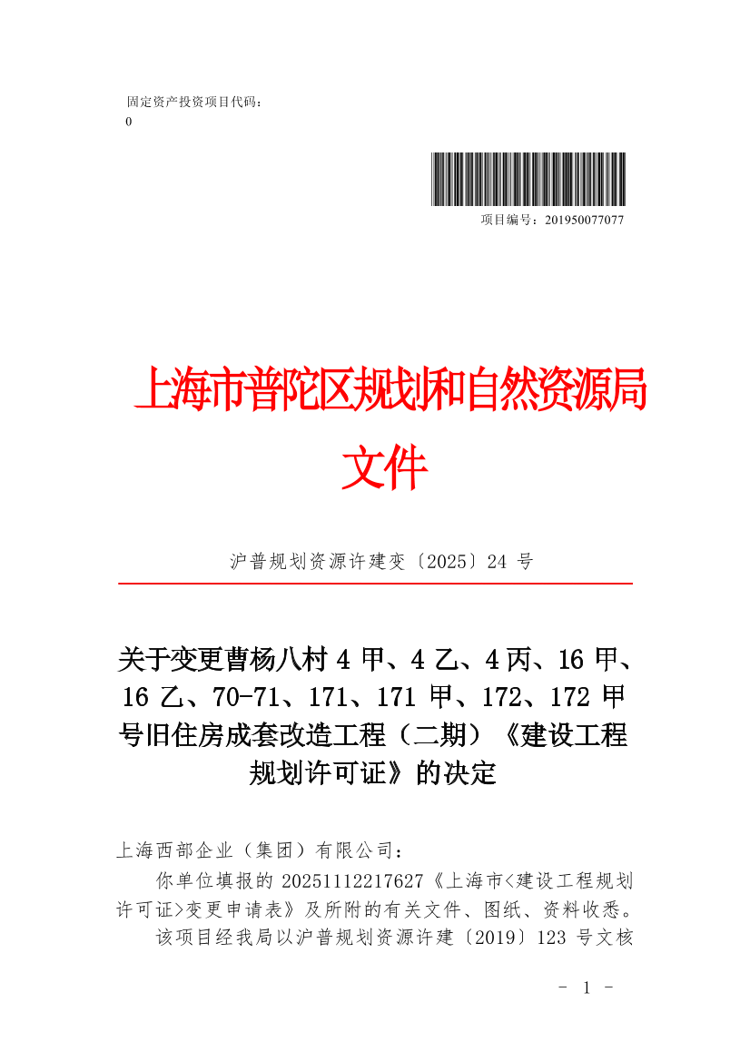 关于变更曹杨八村4甲、4乙、4丙、16甲、16乙、70-71、171、171甲、172、172甲号旧住房成套改造工程(二期)《建设工程规划许可证》的决定