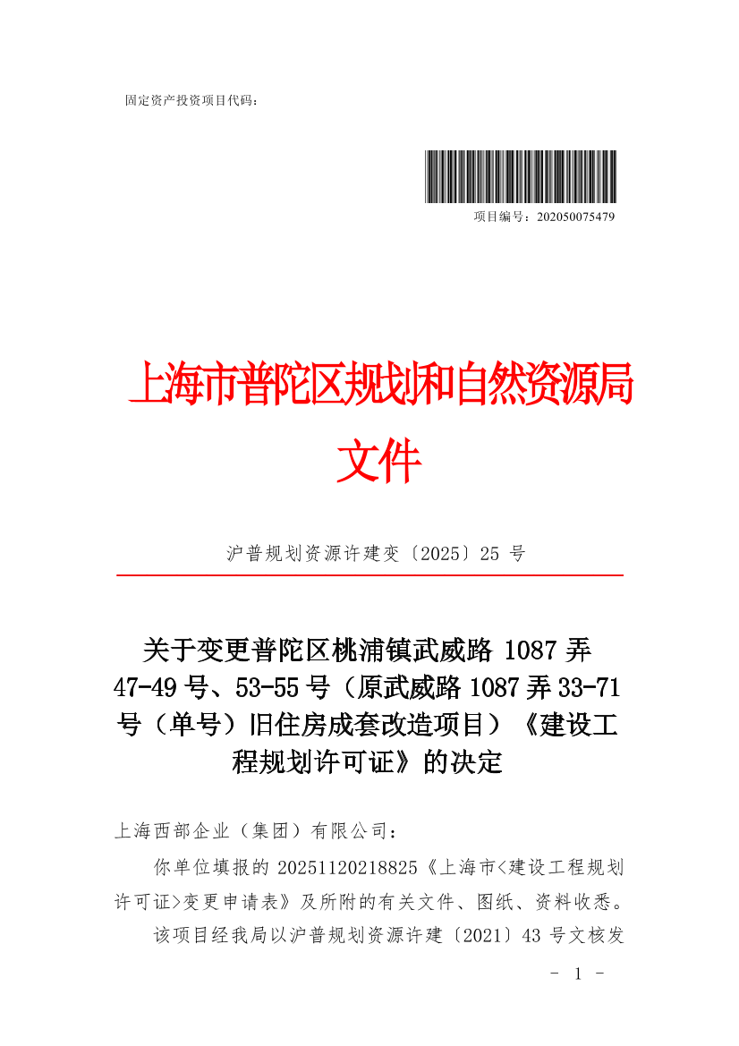 关于变更普陀区桃浦镇武威路1087弄47-49号、53-55号(原武威路1087弄33-71号(单号)旧住房成套改造项目)《建设工程规划许可证》的决定