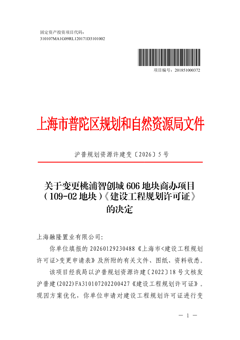关于变更桃浦智创城606地块商办项目(109-02地块)《建设工程规划许可证》的决定