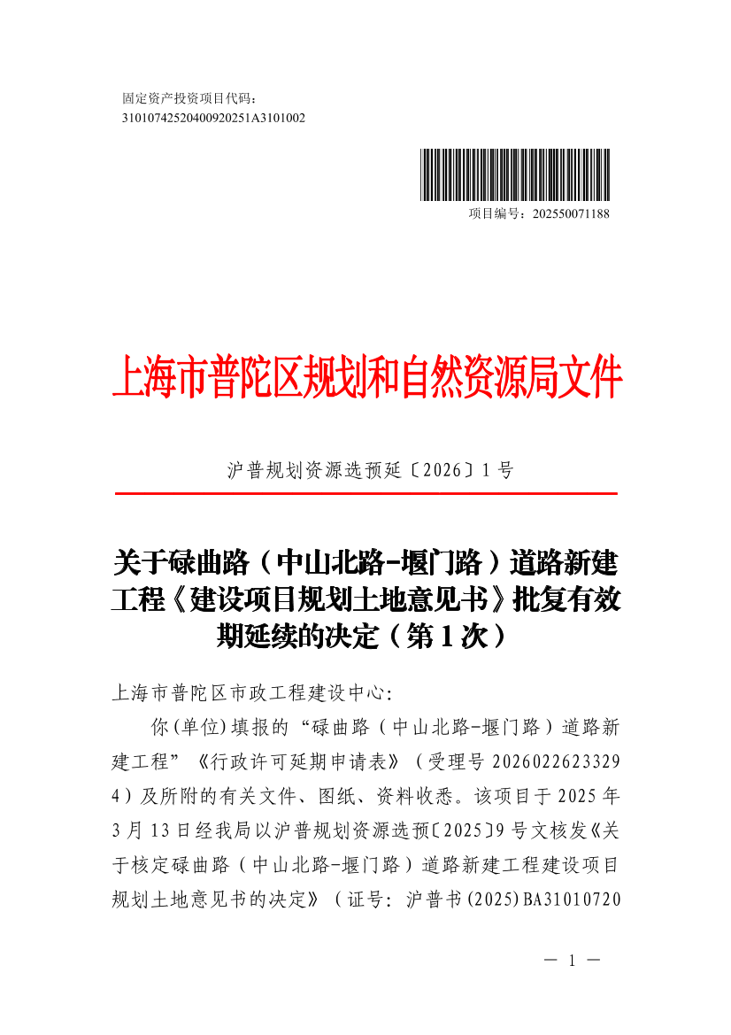 你(单位)填报的“碌曲路(中山北路-堰门路)道路新建工程”《行政许可延期申请表》(受理号 2026022623329 4 )及所附的有关文件、图纸、资料收悉。该项目于2025年3月13日经我局以沪普规划资源选预〔2025〕9 号文核发《关于核定碌曲路( 中山北路-堰门路)道路新建工程建设项目规划土地意见书的决定》(证号:沪普书 (2025)BA310107202500194, 以下简称《决定》 ),并以沪普规划资源选预变〔2025〕5号文同意变更该《决定》,现你(单位)(第1次 )向我局提出延续《决定》有效期的申请。
