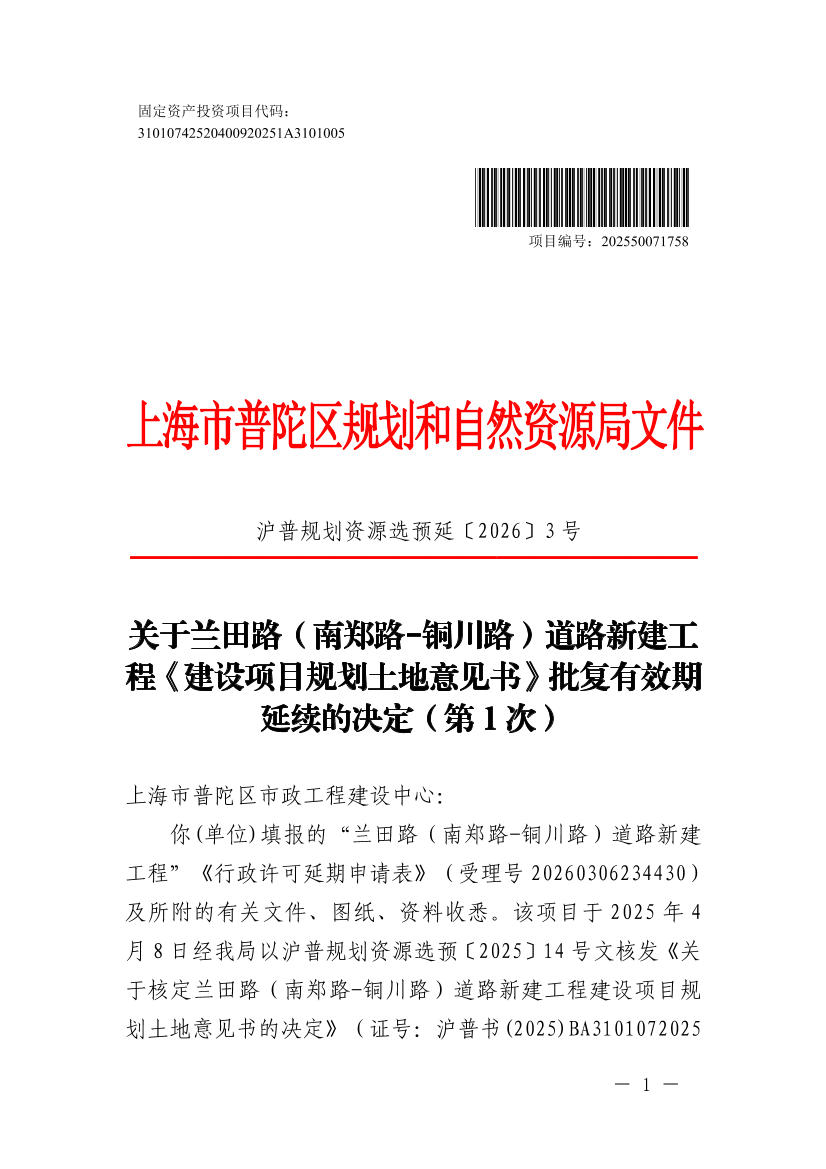 你(单位)填报的“兰田路(南郑路-铜川路)道路新建工程”《行政许可延期申请表》(受理号 20260306234430 )及所附的有关文件、图纸、资料收悉。该项目于2025年4月8日经我局以沪普规划资源选预〔2025〕14号文核发《关于核定兰田路( 南郑路-铜川路)道路新建工程建设项目规划土地意见书的决定》(证号:沪普书(2025)BA310107202500307,以下简称《决定》 )。现你(单位 )( 第 1 次 )向我局提出延续《决定》有效期的申请。