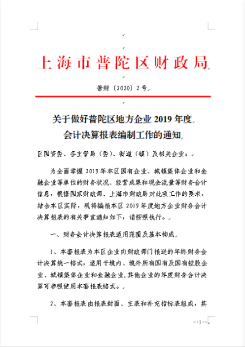 关于做好普陀区地方企业2019年度会计决算报表编制工作的通知