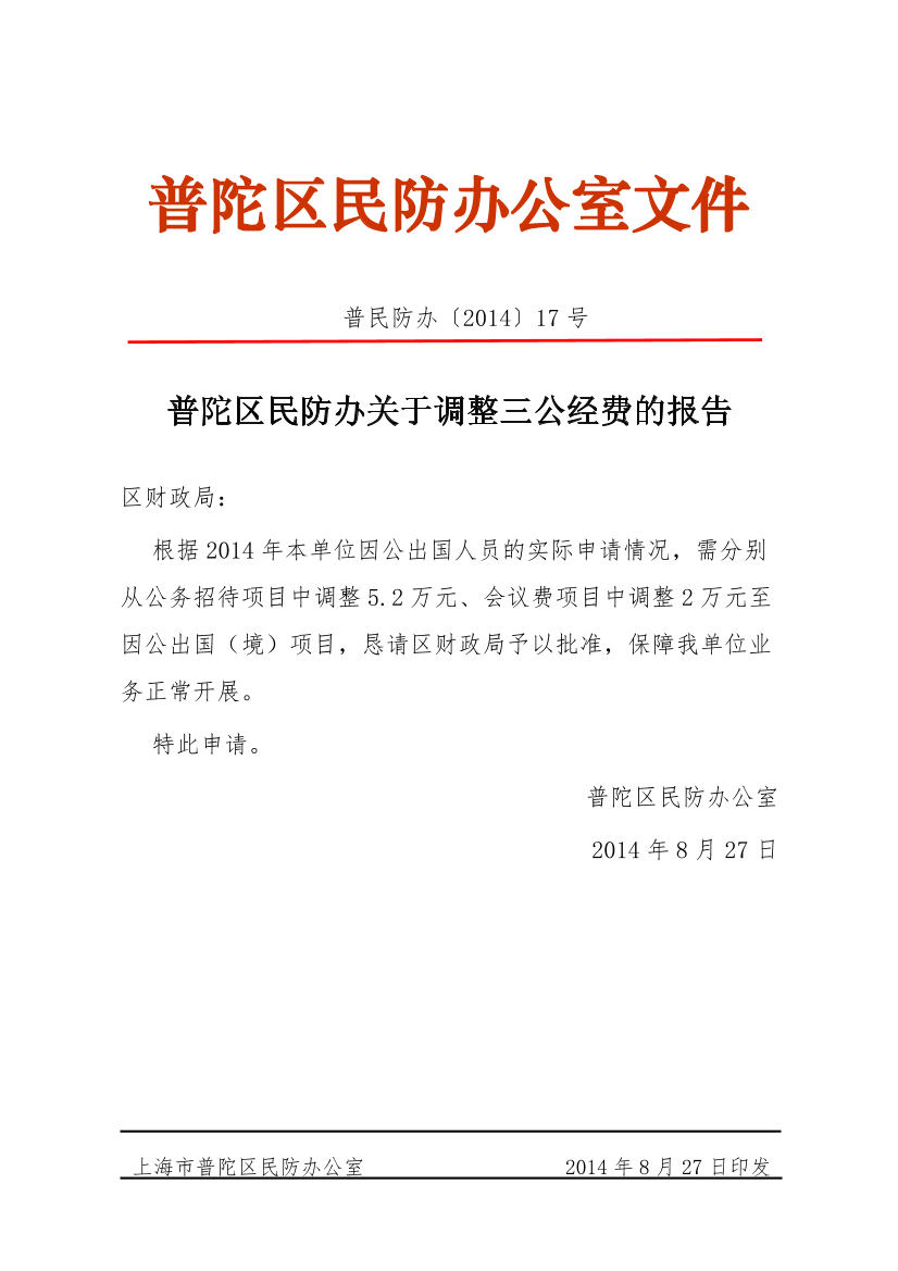 根据2014年本单位因公出国人员的实际申请情况,需分别从公务招待项目中调整5.2万元、会议费项目中调整2万元至因公出国(境)项目,恳请区财政局予以批准,保障我单位业务正常开展。