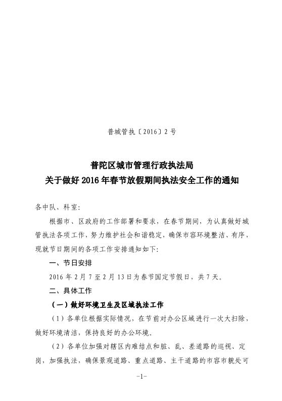 普陀区城市管理行政执法局关于做好2016年春节放假期间执法安全工作的通知