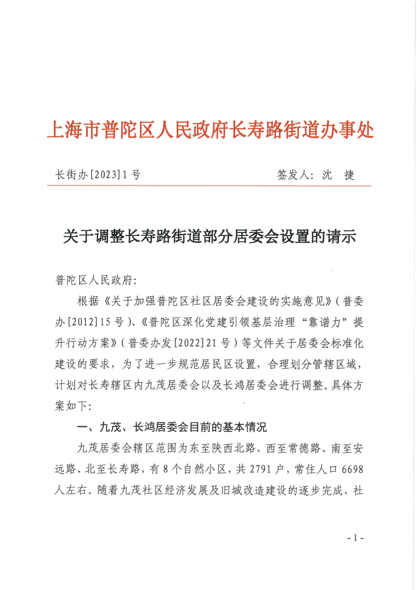 根据《关于加强普陀区社区居委会建设的实施意见》(普委办[2012]15号)、《普陀区深化党建引领基层治理“靠谱力”提升行动方案》(普委办发[2022]21号)等文件关于居委会标准化建设的要求,为了进一步规范居民区设置,合理划分管辖区域,计划对长寿辖区内九茂居委会以及长鸿居委会进行调整。具体方案如下:
